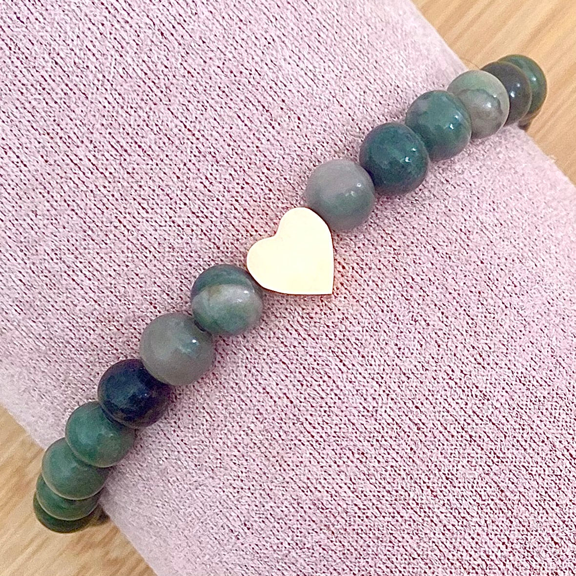 Embrace earthy elegance with this 6mm Green Line Jasper bracelet, adorned with a dainty anti-tarnish heart charm. Each natural stone bead features unique green tones and subtle patterns, hand-strung for comfort and available in multiple sizes to ensure the perfect fit.